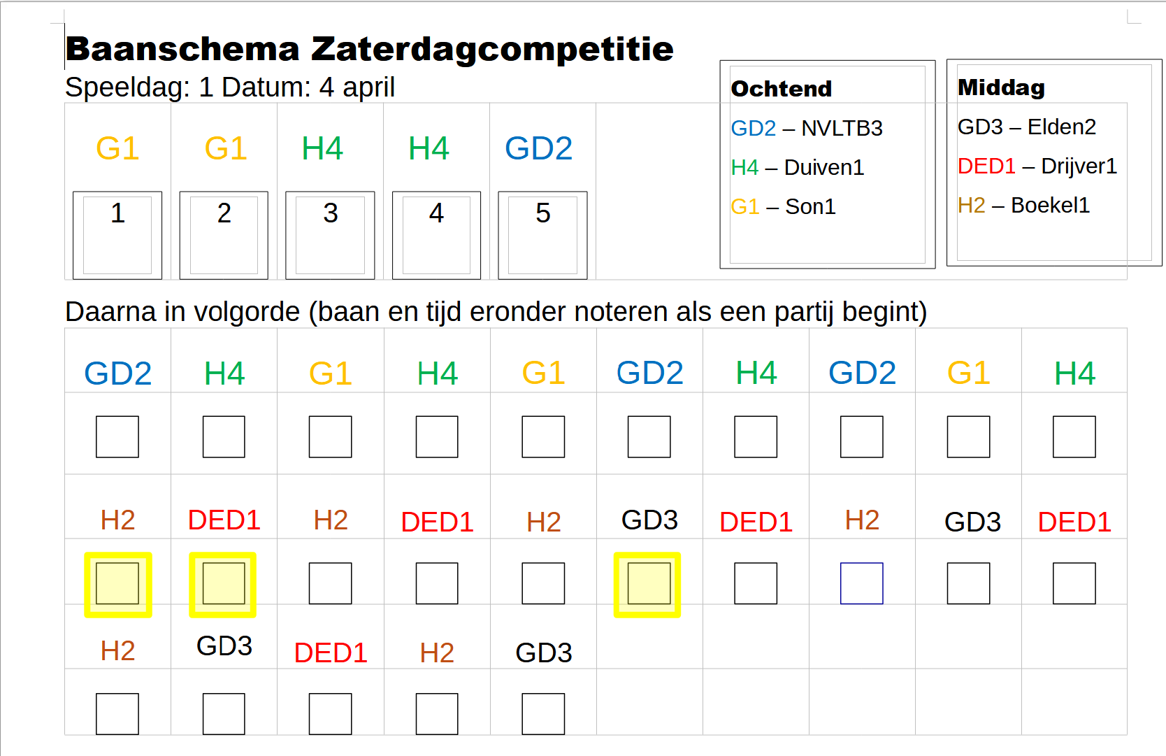 Met geel gemarkeerde baanvakjes geven aan dat dit de eerste wedstrijd van een team is. In het schema krijgt zo'n team relatief snel een baan toegewezen. Als een team 60 minuten op een baan moet wachten, dan heeft dat team namelijk het recht om het park te verlaten.